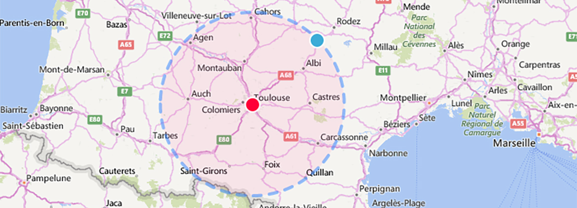 Je peux me déplacer dans un rayon de 100 kms autour de Toulouse, sur les départements suivants :